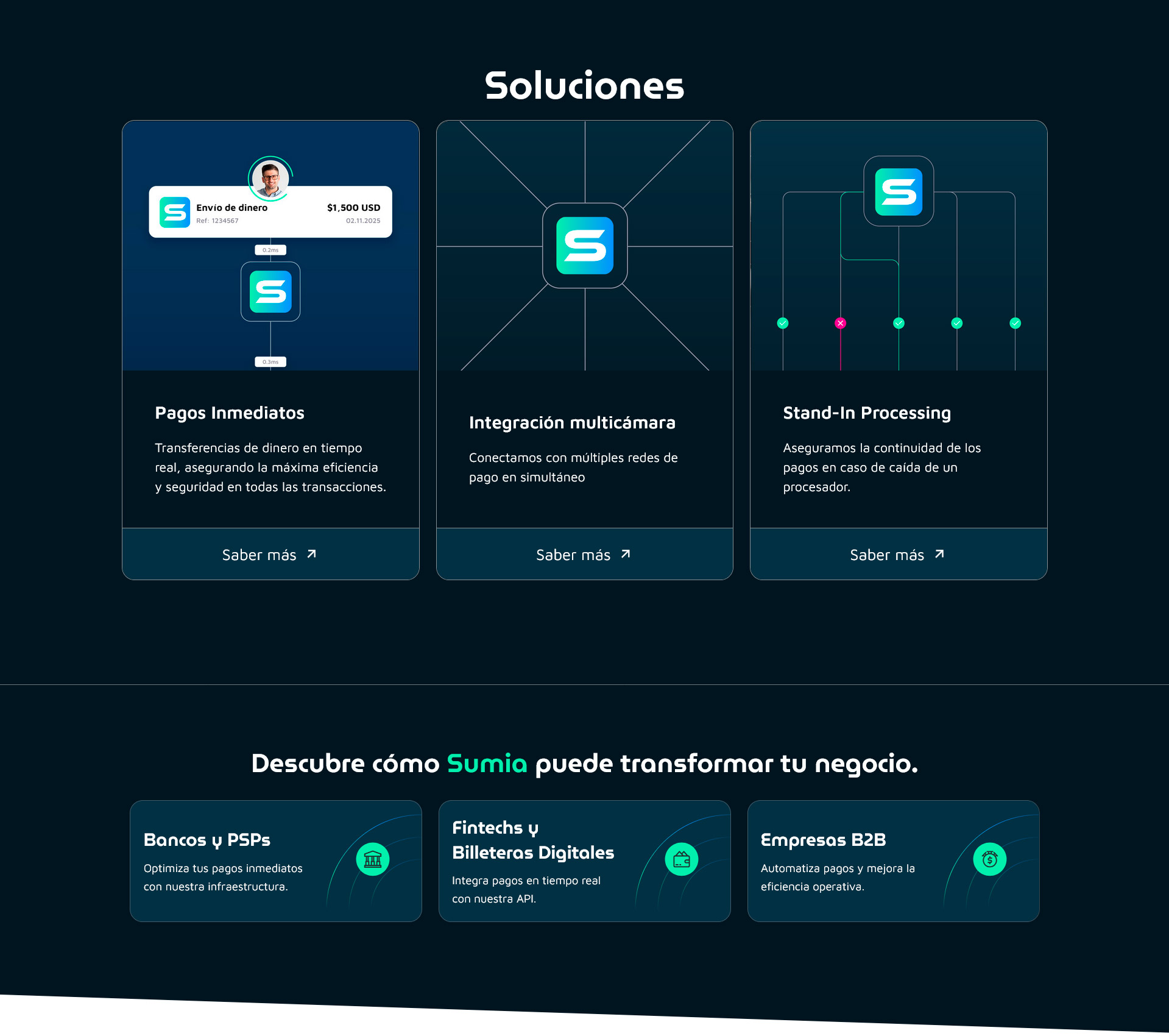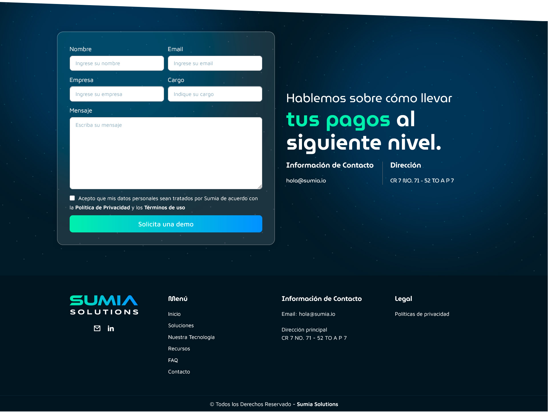 En Maze Chile, diseñamos el sitio institucional de Sumia, una fintech latinoamericana, enfocándome en una experiencia clara y moderna para presentar sus soluciones de pagos inmediatos. Creamos secciones visuales destacadas con gráficos, botones interactivos (“Solicita demo”, “Saber más”) y un formulario de contacto accesible. El diseño modular con componentes reutilizables asegura consistencia y escalabilidad, mientras que la estética refuerza la confiabilidad y presencia profesional de la marca.
